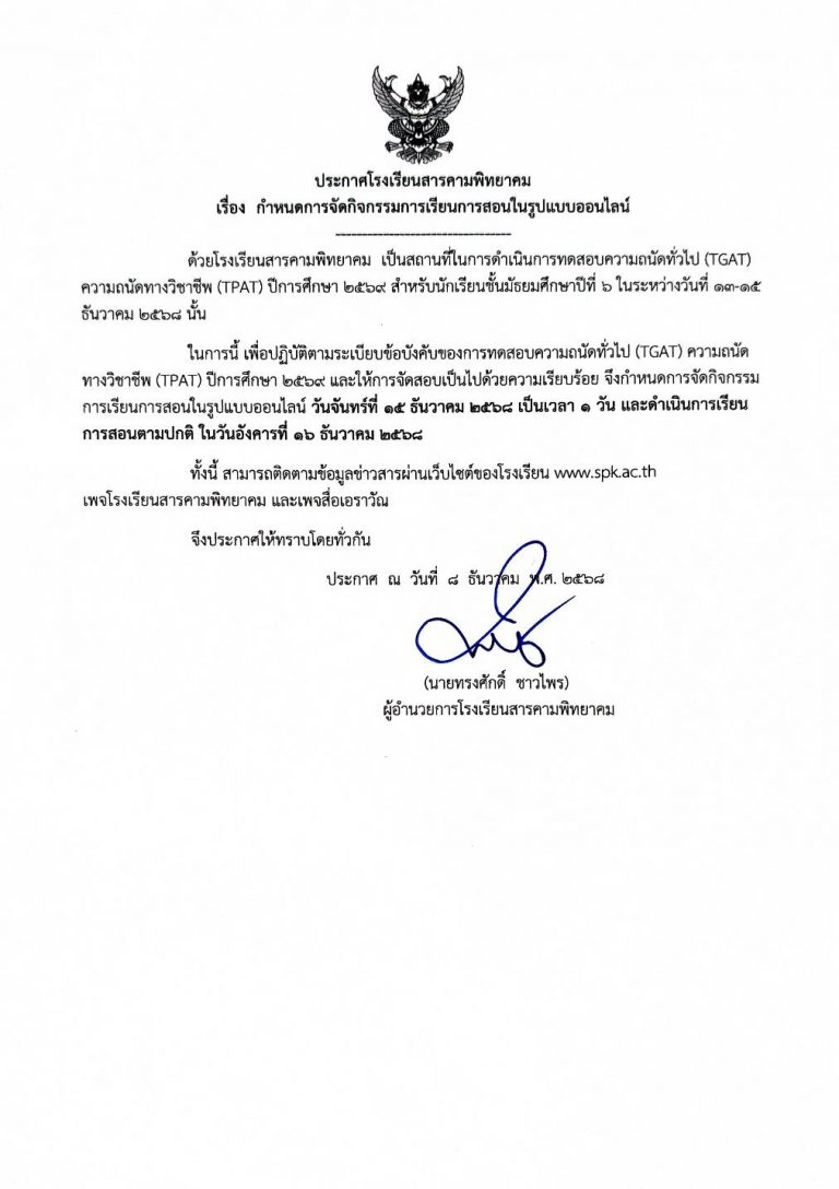 ประกาศกำหนดการจัดกิจกรรมการเรียนการสอนในรูปแบบออนไลน์ในวันจันทร์ ที่ 15 ธันวาคม 2568