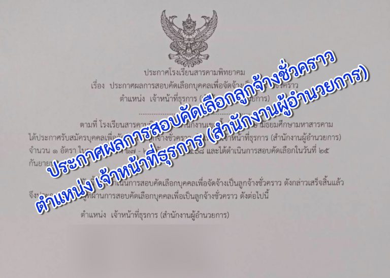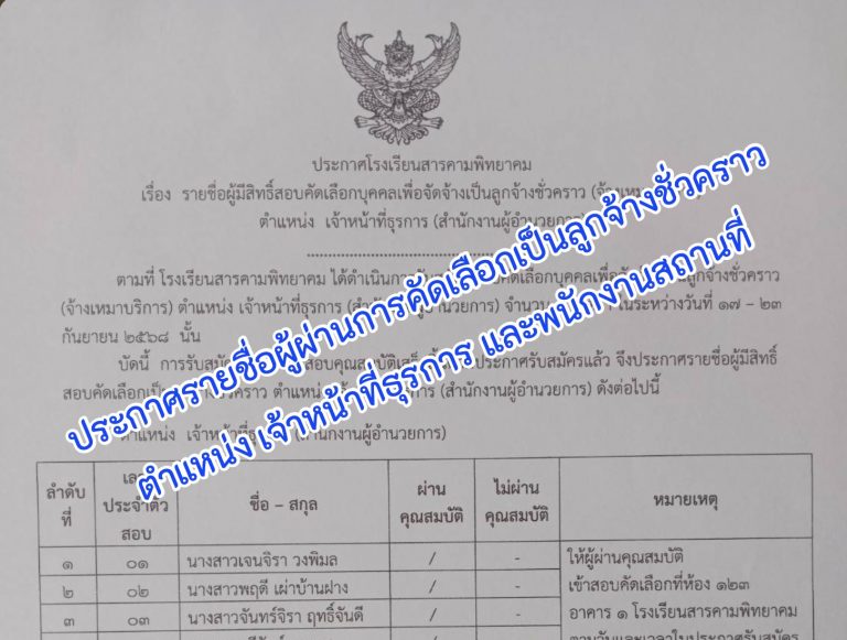 ประกาศผลการสอบคัดเลือกเป็นลูกจ้างชั่วคราว ตำแหน่งเจ้าหน้าที่ธุรการ (สำนักงานผู้อำนวยการ)