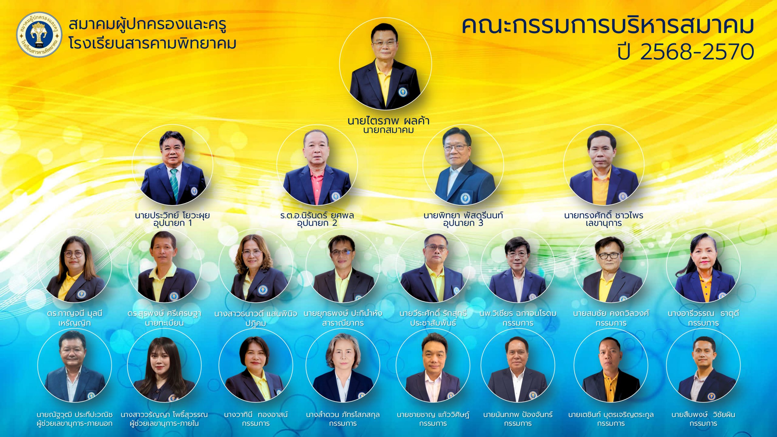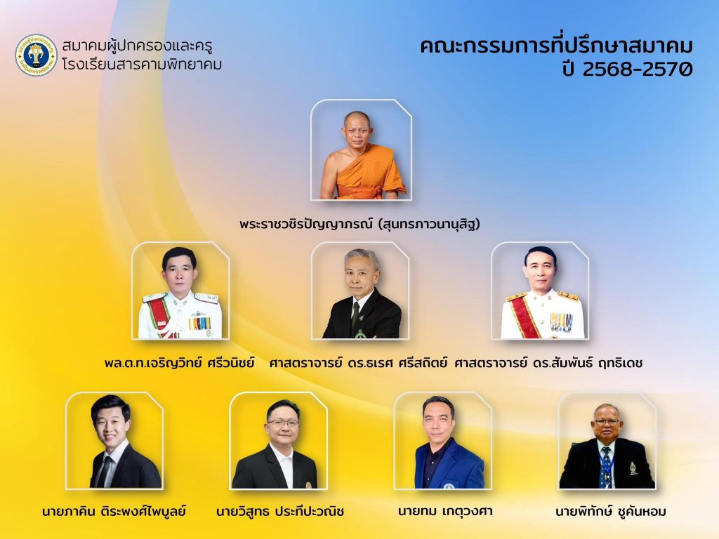 คณะกรรมการบริหารสมาคมผู้ปกครองและครูโรงเรียนสารคามพิทยาคม (ปี 2568 – 2570) คณะกรรมการบริหารสมาคมผู้ปกครองและครูโรงเรียนสารคามพิทยาคม (ปี 2568 – 2570) คณะกรรมการที่ปรึกษาสมาคมผู้ปกครองและครูโรงเรียนสารคามพิทยาคม (ปี 2568-2570) โลโก้สมาคม เพจเฟสบุ้คสมาคมฯ