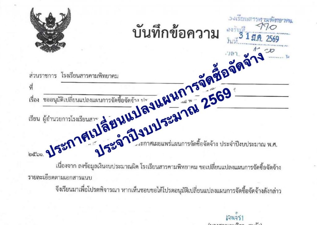 ประกาศอนุมัติเปลี่ยนแปลงแผนการจัดซื้อจัดจ้าง ประจำปีงบประมาณ 2569 โรงเรียนสารคามพิทยาคม