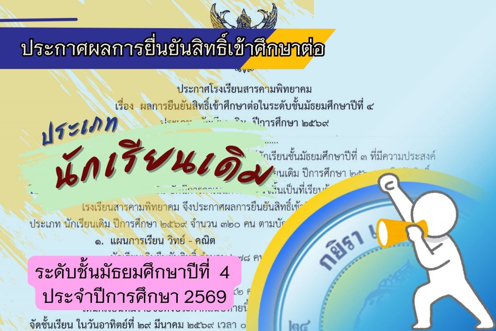 ประกาศผลการยืนยันสิทธิ์เข้าศึกษาต่อ ระดับชั้นมัธยมศึกษาปีที่ 4 ประเภทสิทธิ์นักเรียนเดิม ประจำปีการศึกษา 2569