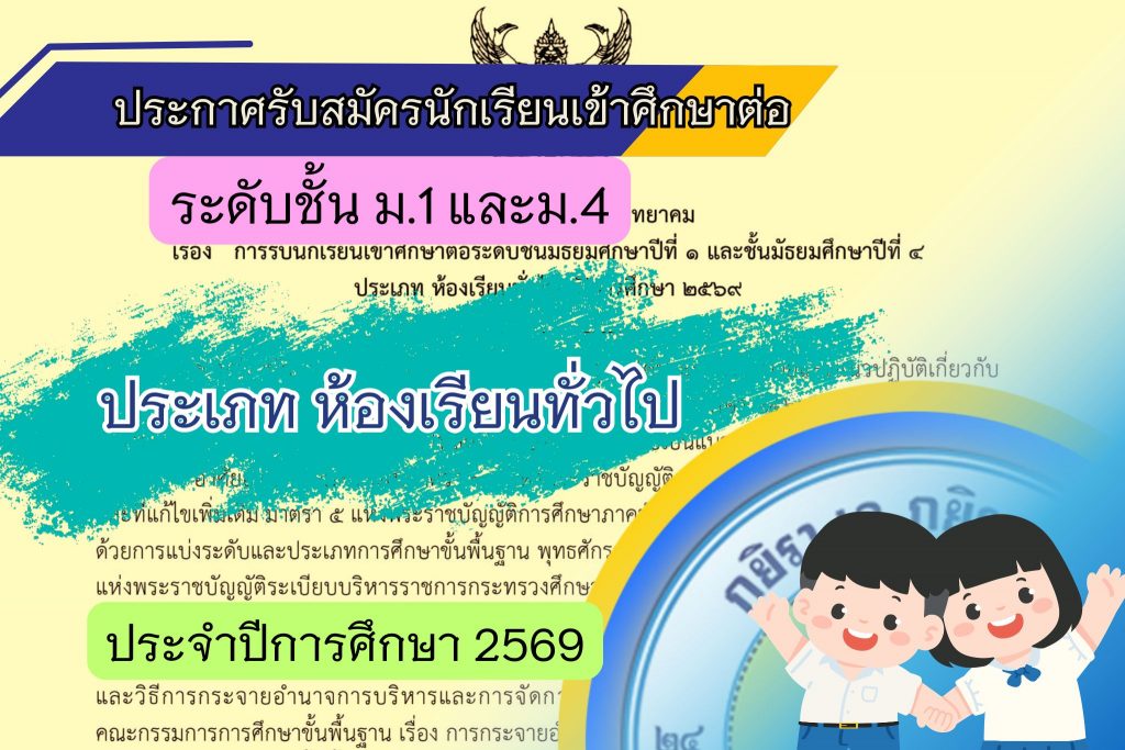 ประกาศรับสมัครนักเรียนนักเรียนเข้าศึกษาต่อประเภทห้องเรียนทั่วไป ชั้นมัธยมศึกษาปีที่ 1 และ4 ประจำปีการศึกษา 2569