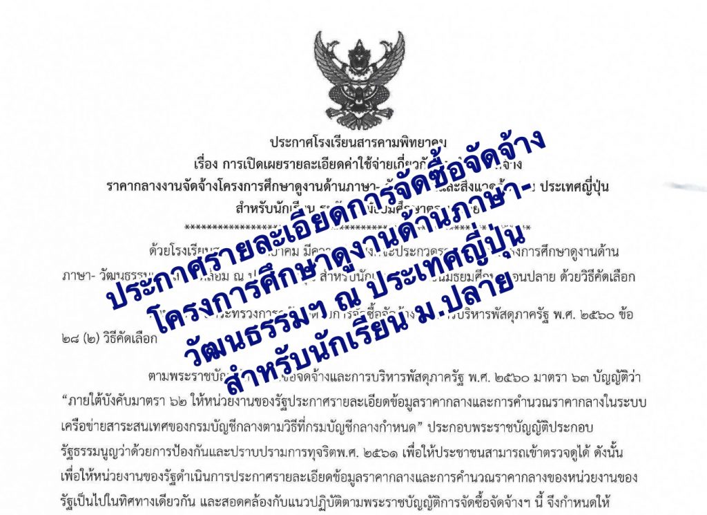 ประกาศโรงเรียนสารคามพิทยาคม เรื่อง การเปิดเผยรายละเอียดค่าใช้จ่ายเกี่ยวกับการจัดซื้อจัดจ้างราคากลางโครงการจัดจ้างศึกษาดูงาน ด้านภาษา-วัฒนธรรม และสิ่งแวดล้อม ณ ประเทศญี่ปุ่น สำหรับนักเรียนระดับชั้นมัธยมศึกษาตอนปลาย โรงเรียนสารคามพิทยาคม ดังรายละเอียด