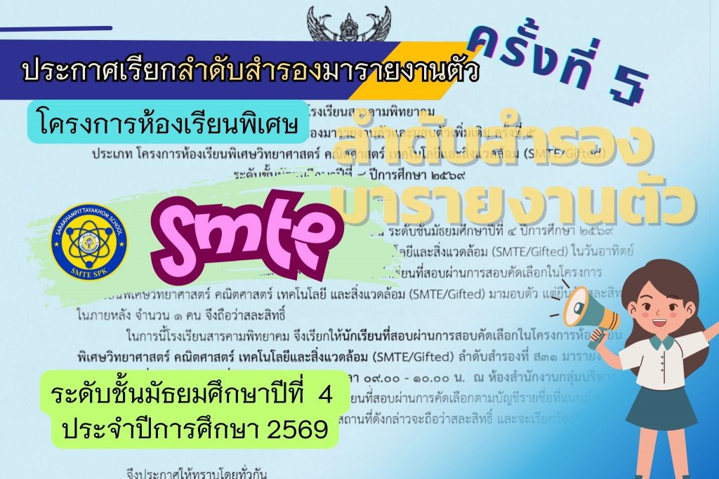 ประกาศเรียกลำดับสำรองมารายงานตัว (ครั้งที่ 5) ชั้น ม.4 ปีการศึกษา 2569 โครงการห้องเรียนพิเศษฯ SMTE/Gifted