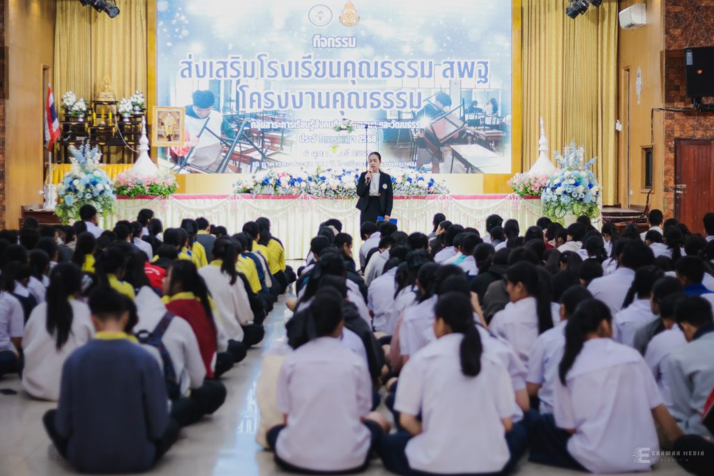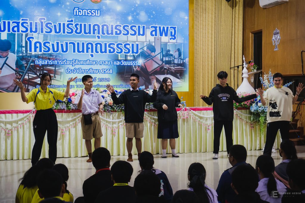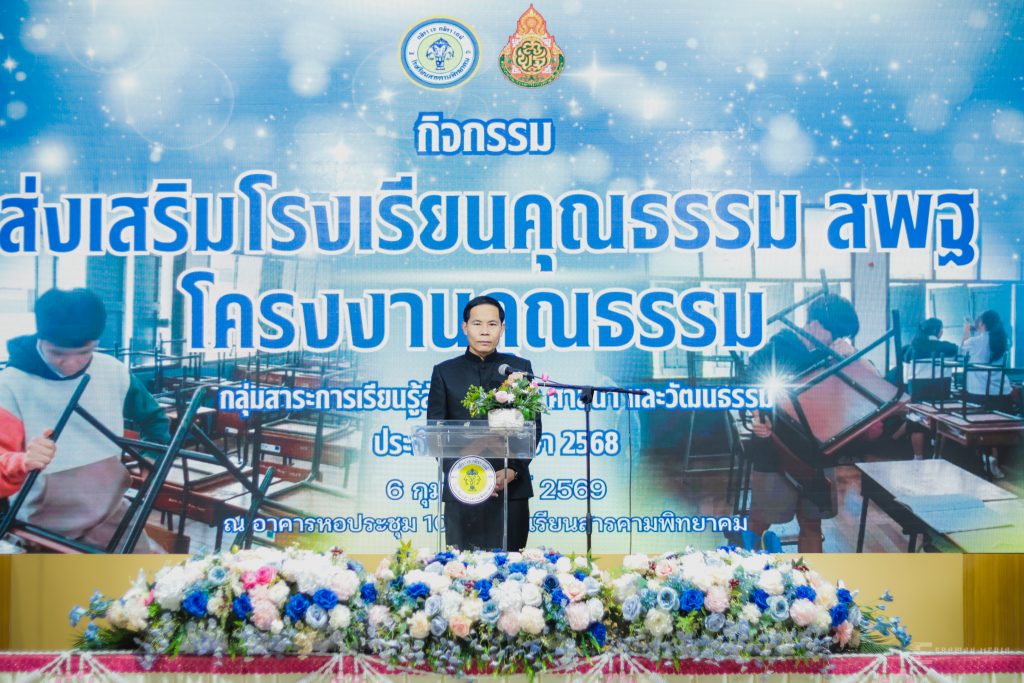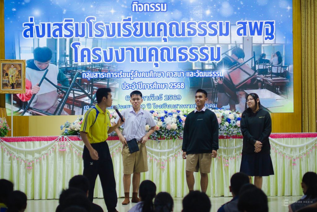 เมื่อวันศุกร์ที่ 6 กุมภาพันธ์ 2569 นายทรงศักดิ์ ชาวไพร ผู้อำนวยการโรงเรียนสารคามพิทยาคม มอบหมายให้กลุ่มสาระการเรียนรู้สังคมศึกษา ศาสนาและวัฒนธรรมจัดกิจกรรมส่งเสริมโรงเรียนคุณธรรม ตามโครงการโรงเรียนคุณธรรม สพฐ. ประจำปีการศึกษา 2568 ณ หอประชุมครบรอบ 100 ปี โรงเรียนสารคามพิทยาคม