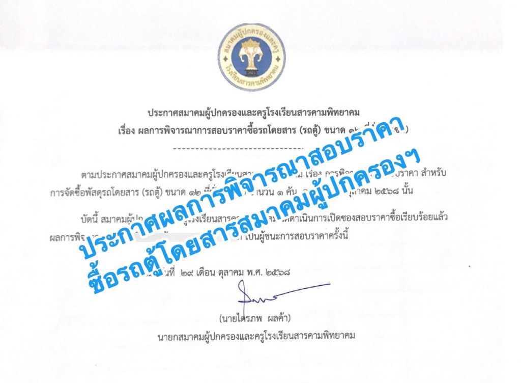 ประกาศสมาคมผู้ปกครองและครูโรงเรียนสารคามพิทยาคม เรื่อง ผลการพิจารณาสอบราคาซื้อรถตู้โดยสารขนาด 12 ที่นั่ง (ดีเซล) ดังรายละเอียด