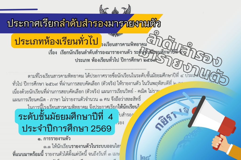 ประกาศเรียกลำดับสำรองมารายงานตัว (ครั้งที่ 1) ชั้นมัธยมศึกษาปีที่ 4 ประเภทห้องเรียนทั่วไป ปีการศึกษา 2569 ดังรายละเอียด