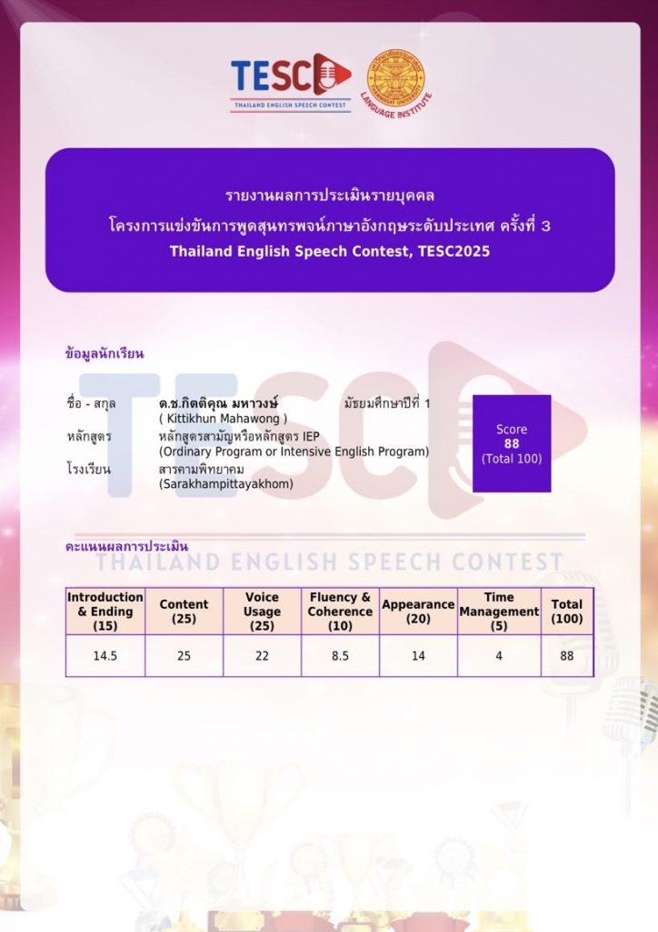 นายทรงศักดิ์ ชาวไพร ผู้อำนวยการโรงเรียนสารคามพิทยาคม มอบหมายให้กลุ่มสาระการเรียนรู้ภาษาต่างประเทศ นำนักเรียนเข้าประกวดสุนทรพจน์ระดับประเทศ TESC ระดับชั้นมัธยมศึกษาปีที่ 1 ได้แก่เด็กชายกิตติคุณ มหาวงษ์ นักเรียนชั้น ม. 1 / 11 และได้รับรางวัลเกียรติบัตรเหรียญทอง ครูผู้ฝึกสอน นางสาวจิราภรณ์ สารศรี